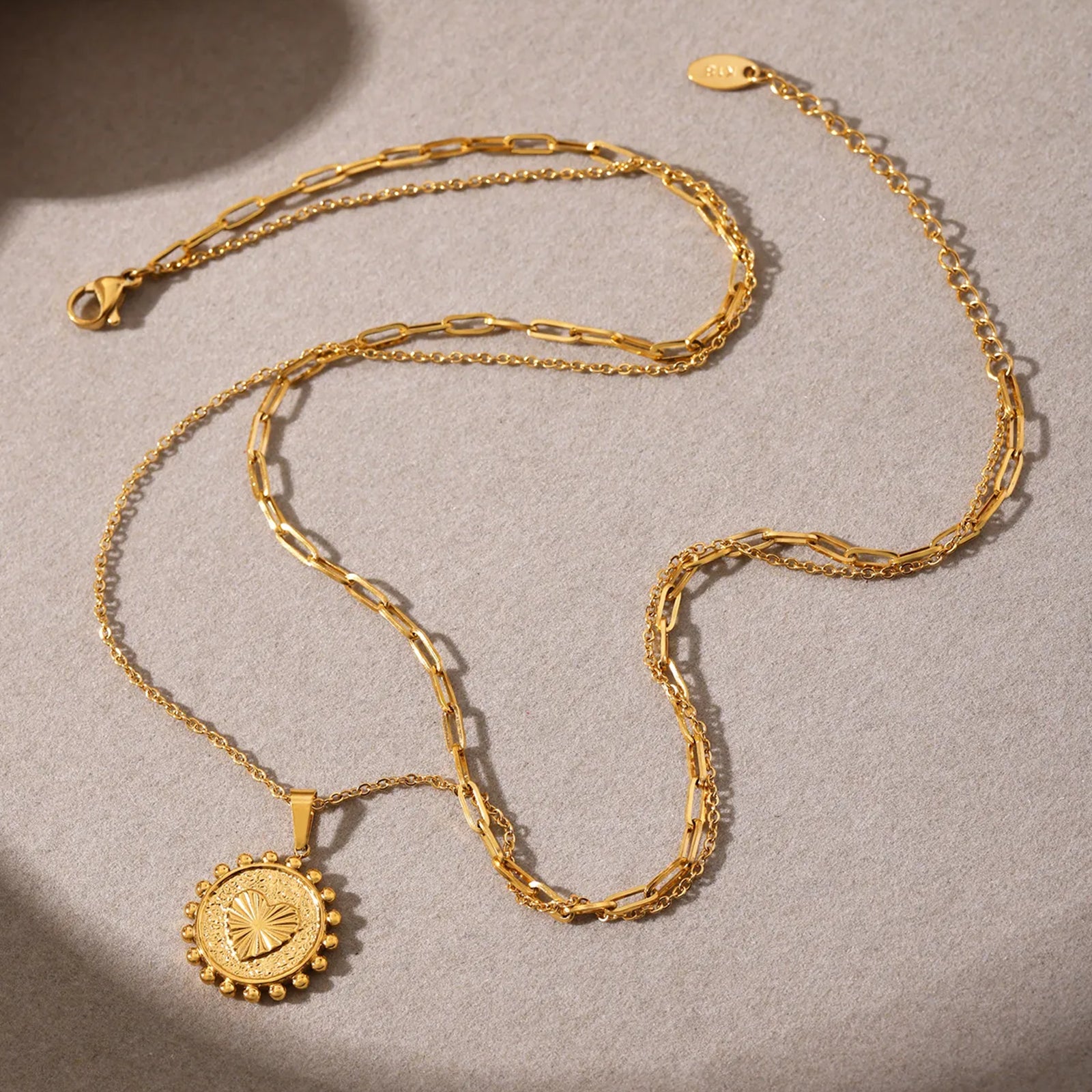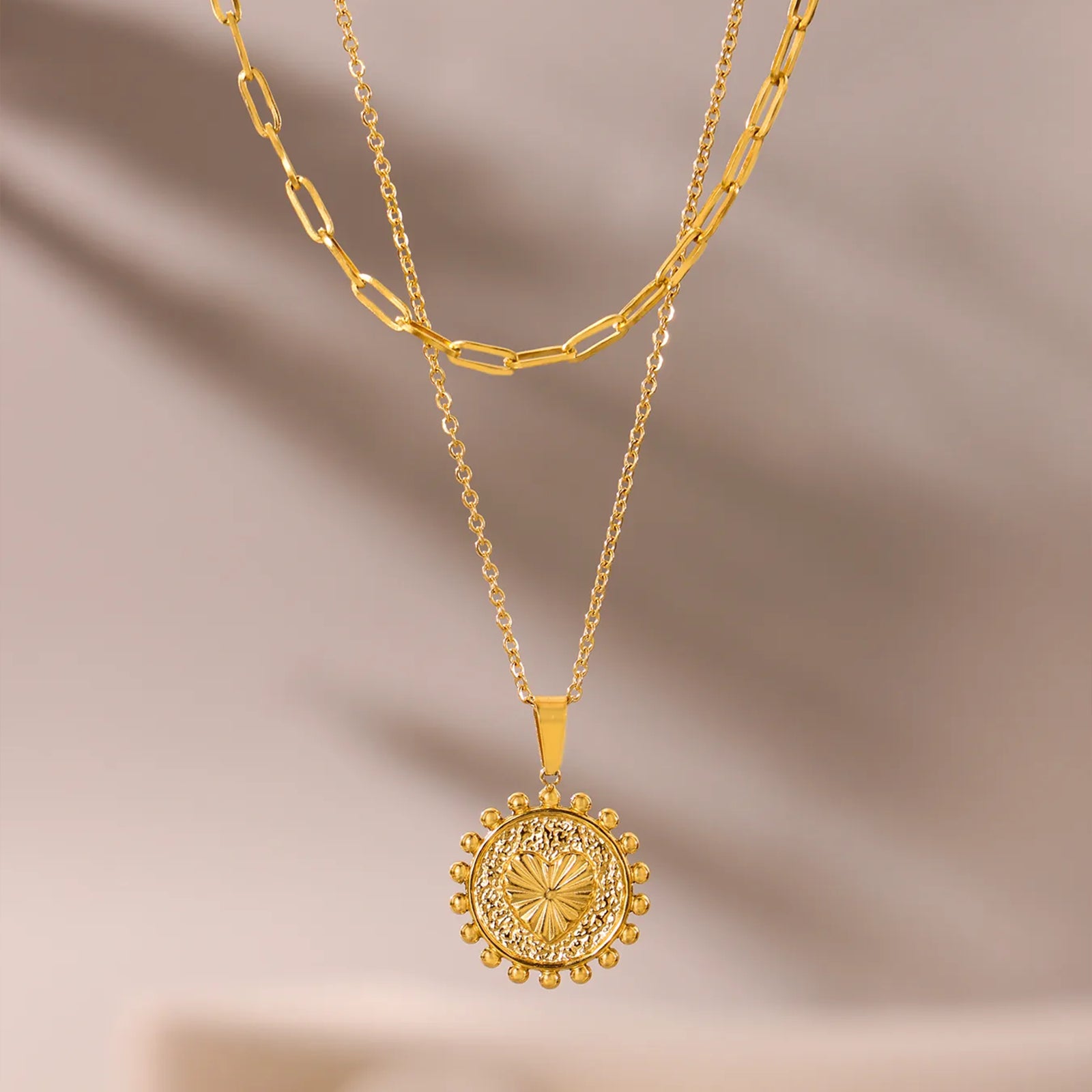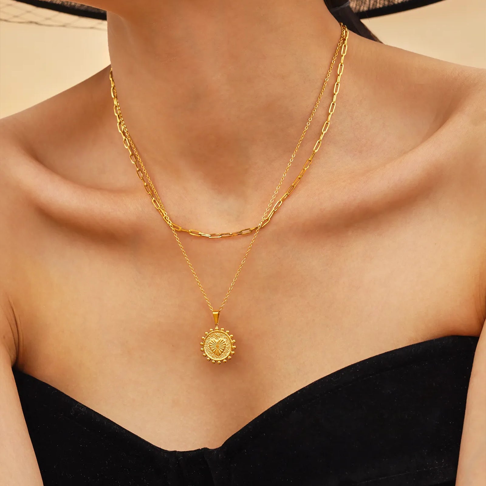 Deux chaînes contrastées, l’une texturée, l’autre lisse, mettent en valeur un médaillon gravé façon soleil rayonnant.